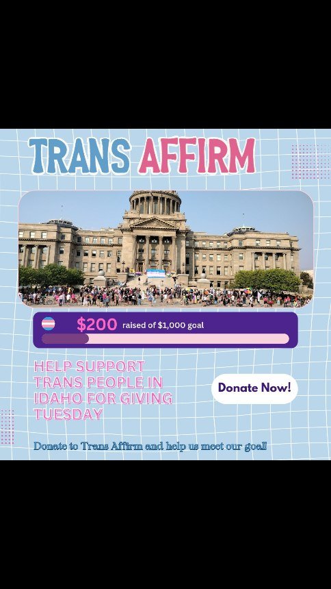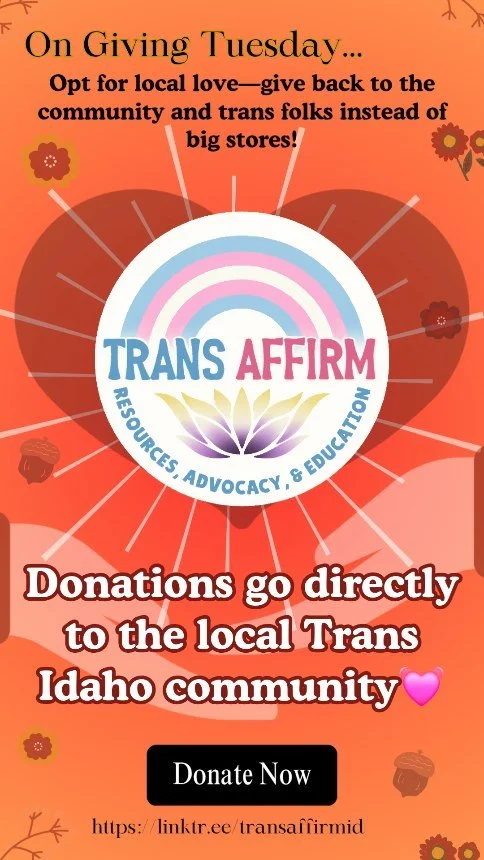 Trans Affirm, Inc. is a 501(c)(3) nonprofit dedicated to supporting trans and gender-diverse individuals across Idaho. We provide essential resources, advocacy, and education to ensure our community has access to gender-affirming care, support networks, and vital services. Through outreach events, direct aid, and partnerships, we strive to create a more inclusive and equitable future for all trans Idahoans!
